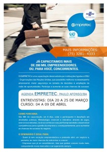 Para orientar quem pretende empreender ou empresários que desejam potencializar seus negócios, o Sebrae abre inscrições para uma nova turma do Empretec em Paulo Afonso . O Empretec é um dos mais bem sucedidos programas do SEBRAE - reúne quase vinte mil empresários por ano, com resultados excelentes. É uma metodologia desenvolvida pela Universidade de Harvard, concedida ao Brasil pela ONU, ministrada com exclusividade pelo SEBRAE. Está voltada para o desenvolvimento de características de comportamento empreendedor e para a identificação de novas oportunidades de negócios. O Empretec não é gratuito, mas parte do investimento é subsidiada pelo SEBRAE. O treinamento acontece em regime intensivo, oito horas por dia, durante seis dias. São 60 horas que ampliam a compreensão do empresário. Você poderá ter assistência técnica na elaboração ou ajuste de seu plano de negócios, envolvendo aspectos de mercado, tecnologia, informação, administração, marketing e finanças. E, terá também oportunidades para participar de cursos, seminários, feiras e rodadas de negócios.
