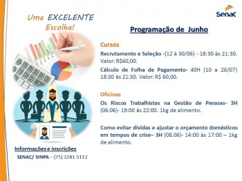 A partir de hoje, os interessados nos cursos profissionalizantes do SENAC já podem correr para fazer as inscrições. A programação para as turmas de junho e julho já foi divulgada e a procura pelas vagas é grande.