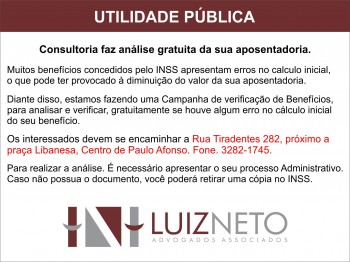Nosso escritório trabalha para garantir o benefício integral de cada cliente”. Luiz Neto lembra que para realizar a análise é necessário apresentar o seu processo administrativo. Caso ainda não tenha, você pode retirar uma cópia no INSS. Os interessados em fazer uma análise gratuita podem ligar no telefone 3828- 1745
