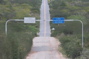 As placas na rodovia BA-110, na divisa entre os Estados de Sergipe e Bahia, apresentam duas realidades.  Observe o completo abandono da rodovia do lado da Bahia e o tapete do lado sergipano. A foto difere e muito da propaganda do governador Wagner. E pensar que essa estrada é a mesma que dá acesso aos projetos de piscicultura e turismo.