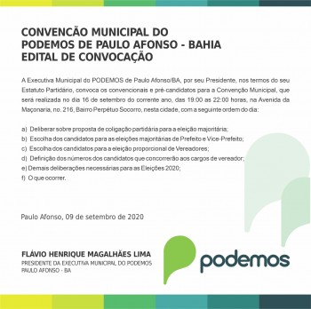 Mais uma legenda em Paulo Afonso está pronta para sua convenção municipal. O PODEMOS está convidando todos os convencionais e pre candidatos(as) para o evento, marcado para a próxima quarta-feira (16), às 19h, na Avenida da Maçonaria, 216.