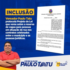 Nesta segunda (22), o vereador Paulo Tatu (PP) protocolou na Casa Legislativa um Projeto de Lei que visa o estabelecimento da reserva de vagas nos contratos celebrados entre o município e as pessoas jurídicas, que gerem novos postos de trabalho.