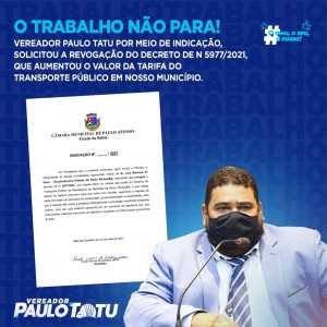 O Vereador Paulo Tatu apresentou na sessão desta segunda 03/05, uma indicação em plenário solicitando ao Prefeito Luiz de Deus que revogue o decreto de nº 5977/2021 que aumentou em 33% a tarifa do transporte público em nossa cidade.