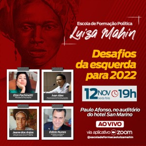 A Escola de Formação Política Luiza Mahin promove, na próxima sexta-feira (12), um debate sobre os “Desafios da esquerda para 2022”. O evento acontece no auditório do Hotel San Marino, em Paulo Afonsos, às 19h, e será pela internet, através do aplicativo Zoom.