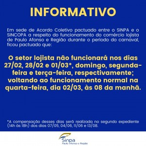 As lojas do centro comercial de Paulo Afonso e do bairro Tancredo Neves estarão fechadas nos dias 27/02, 28/2 (de carnaval ) e 01/03, conforme publicação no informativo do Sinpa /Sincopa.