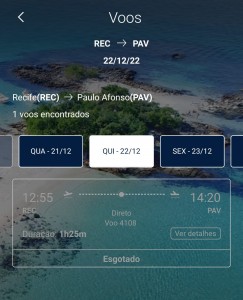 De acordo com um funcionário  da concessionária que administra o Aeroporto  na cidade do Bem e do Avanço, o voo parte de Recife às 12:55 e chega em Paulo Afonso, às 14h20min, inclusive todas as passagens já estão lotadas, afirmou um empresário em entrevista ao Site.