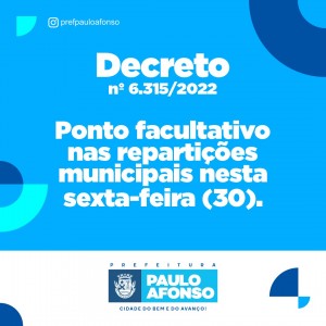 A Prefeitura decretou ponto facultativo nas repartições públicas municipais nesta sexta-feira (30), data que antecede as comemorações alusivas ao Ano Novo.
