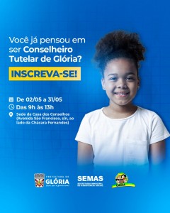 O Conselho Municipal dos Direitos da Criança e do Adolescente – CMDCA, informa que as inscrições para a escolha dos novos conselheiros tutelares do Município de Glória, quadriênio 2024-2028, terão início no dia 02/05 até o dia 31/05, o local da inscrição será na Casa dos Conselhos, localizada na Avenida São Francisco, ao lado da Chácara Fernandes, Centro de Glória, das 09:00h às 13:00h.