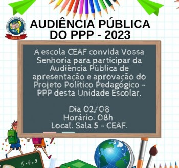 E nesta quarta-feira, 2/08, às 8h na Sala 05 do Colégio CEAF, a SEDUC realiza Audiência Pública para aprovação do Projeto Político Pedagógico – PPP desta Unidade Escolar.