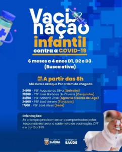 A Prefeitura Municipal de Glória/BA, através da SMS – Secretaria Municipal de Saúde por meio da equipe de imunização, realiza vacinação infantil contra COVID-19, de 6 meses a 4 anos – D1, D2 e D3, nos dias 17, 24 e 28 de agosto, na Sede do município e na área rural.