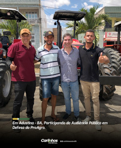 Esta semana, em Adustina-BA, o ex-prefeito de Coronel João Sá, Carlinhos Sobral (MDB) participou de audiência pública em Defesa Pro Agro em apoio ao PDL 58/2025, uma iniciativa essencial para garantir mais segurança e melhorias para os produtores rurais da região. Na ocasião o Carlinhos Sobral afirmou que a "a agricultura é a base da economia da nossa região, e não podemos aceitar que o produtor fique desamparado diante das dificuldades.