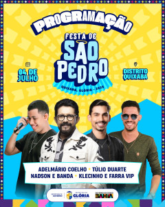 A gestão municipal e a organização da Festa convidam toda a população gloriense e a região para prestigiar mais uma edição do São Pedro da Quixaba, que é sinônimo de alegria, acolhimento e muito forró! Uma festa gratuita, pensada para todas as idades, com estrutura, segurança e uma programação para todos os gostos.