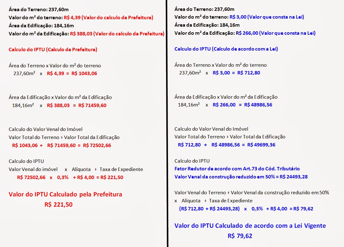 Segundo o Vereador Alex Almeida, que resolveu buscar informações que pudessem elucidar essa questão, após pesquisas na legislação municipal e estadual, o mesmo verificou que o referido tributo estava sendo calculado de forma errada por parte do setor tributário da prefeitura e mostrou, durante a Sessão da Câmara do ultimo dia 15, como deveriam ser feitos os cálculos de maneira correta, segundo preconizam o Código Tributário e a Lei nº 327/2005 que estabelece a Planta genérica de Valores do Município, além disso o mesmo apontou os erros cometidos pelo governo ao realizar tais cálculos. Esses erros estavam aumentando o valor do IPTU da cidade de Glória em até 220%. Os principais e cruciais erros cometidos pelo governo no calculo do IPTU, conforme Alex, são o uso de tabelas de valores diferente do estabelecido por lei para o calculo do Valor Venal do Imóvel e a não aplicação do fator redutor de 50% estabelecido no parágrafo único do Art.73 do Código Tributário Municipal em cima do Valor Venal da Construção. Além disso, segundo o Vereador, as cobranças referentes aos anos de 2006, 2007, 2008 e 2009 são indevidas pois o calculo do IPTU desses quatro anos não podem ser feitos tomando por base uma lei que entrou em vigor em 2010.