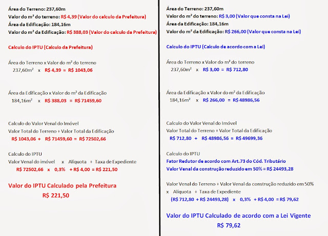 Veja abaixo um quadro comparativo do calculo do IPTU do imóvel de um cidadão de Glória feito com base nos cálculos do Governo e outro calculo feito com base no que está contido nas leis que regem a política tributária do município.