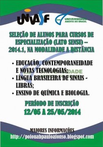 Estão abertas as inscrições para os cursos de especialização em Educação, Contemporaneidade e Novas Tecnologias, Especialização em Docência em Biologia, Especialização em Língua Brasileira de Sinais – LIBRAS e Especialização em Ensino de Química e Biologia, todos na modalidade a distância e inteiramente gratuitos. Os cursos são ofertados pela Secretaria de Educação a Distância (SEaD) da Univasf, e seguem com as inscrições abertas até o dia 25 de maio. A taxa de inscrição será de R$ 80,00 (oitenta reais).