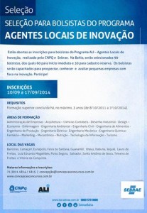 As inscrições estão abertas e vão até o dia 17 de setembro e podem ser feitas pelo site www.concepcaoconcursos.com.br, onde também se encontra o edital completo.A seleção será realizada em 15 municípios baianos.As vagas estão distribuídas entre Salvador, Camaçari, Lauro de Freitas, Barreiras, Luís Eduardo Magalhães, Feira de Santana, Santo Antônio de Jesus, Ilhéus, Itabuna, Teixeira de Freitas, Eunápolis, Porto Seguro, Vitória da Conquista, Guanambi e Jequié. Paulo Afonso não aparece entre os municípos contemplados. Todos os novos Agentes Locais de Inovação receberão bolsas através do CNPq e serão capacitados pelo Sebrae. As inscrições custam R$ 60, para candidatos a agentes, e R$ 80, para candidatos a orientador. O certame está sob a responsabilidade da empresa Concepção Concursos.