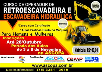 A Associação Comercial, Industrial, Agropecuária e de Serviços de Paulo Afonso, CQMP – Curso de Qualificação Máquinas Pesadas e a UNISA – Universidade Santo Amaro oferece o curso profissionalizante de máquinas pesadas levando informação e capacitação técnica para aqueles que desejam atuar na área de construção civil. Os profissionais que atuam com operação de máquinas pesadas, como Retroescavadeira, Escavadeira Hidráulica, Pá Carregadeira, Rolo Compactador, Caminhão Munck, Empilhadeira, etc. Precisam de conhecimento técnico e especifico para tal, pois não basta apenas dirigir o equipamento, é preciso conhecer todas as funcionalidades que ele possui.